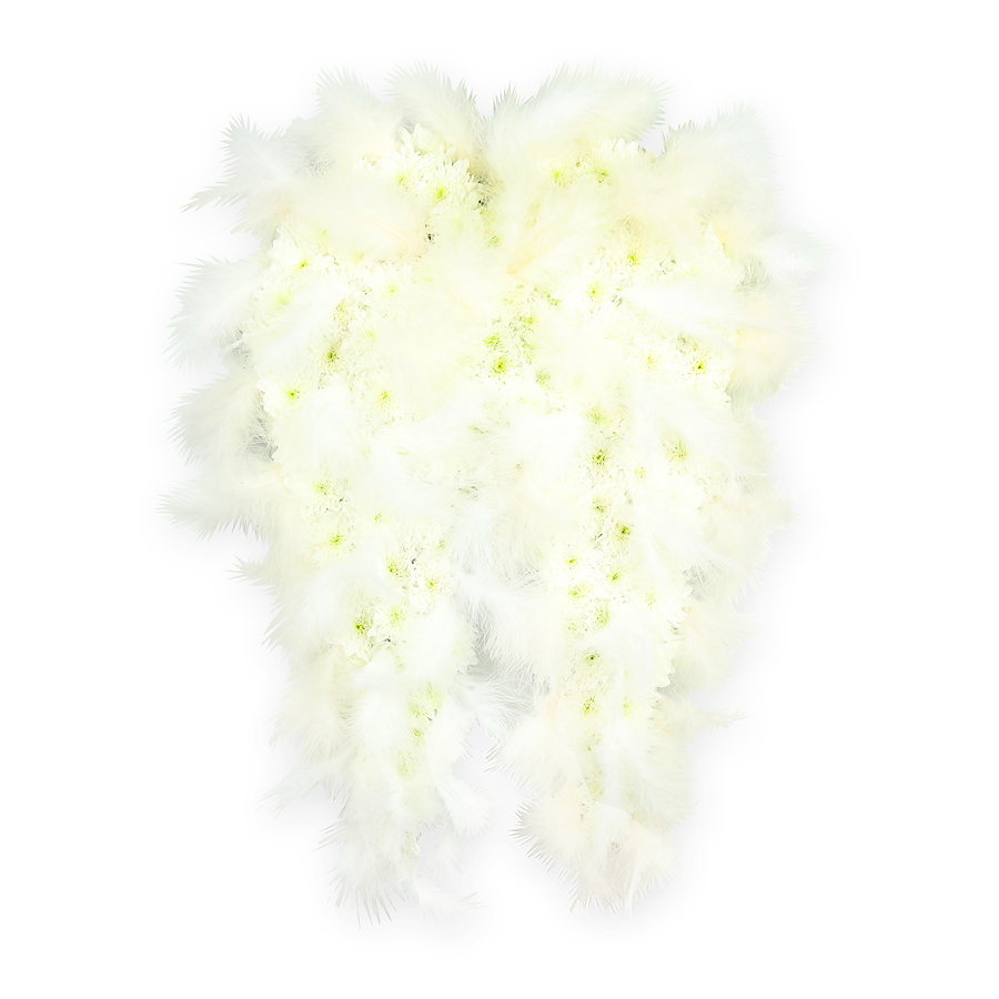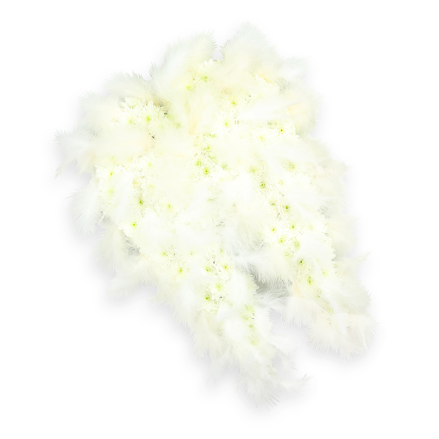 Experience an unmatched blend of artistry and sentiment with our timeless floral tribute. Crafted from fresh, hand-selected white chrysanthemums and accented with soft white feathers, this bouquet exudes an air of dignified beauty and thoughtful design. Ideal for expressing heartfelt condolences or admiration.