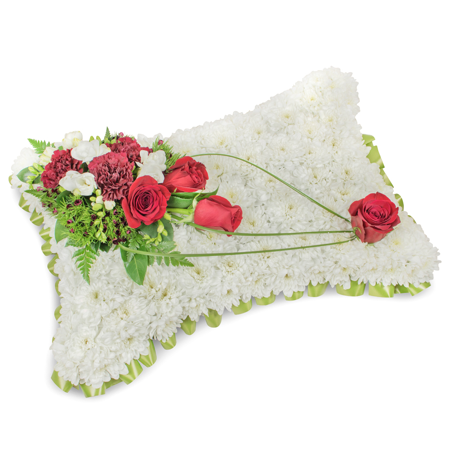 Show your heartfelt condolences with this sophisticated bouquet, featuring a vibrant mix of white chrysanthemums, red roses, white freesias, dark red carnations, dianthus, and bear grass. Each flower is precisely chosen for optimal freshness and beauty, designed to convey both elegance and genuine care.