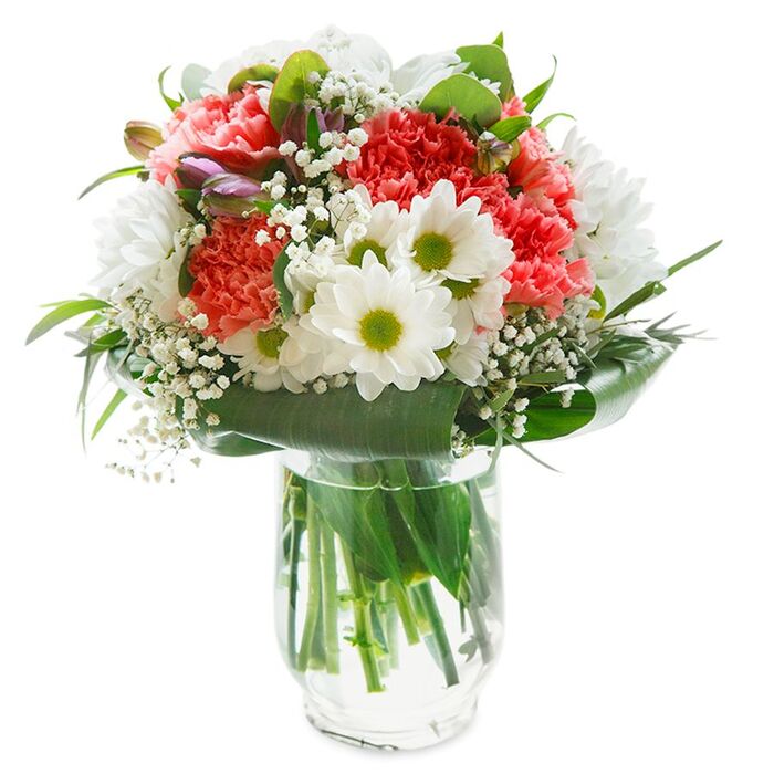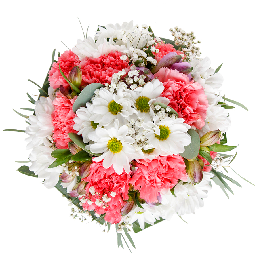 Celebrate any moment with our stunning bouquet, featuring a beautiful mix of white chrysanthemums, delicate gypsophila, and elegant pink carnations, artistically arranged with rich aspidistra foliage.